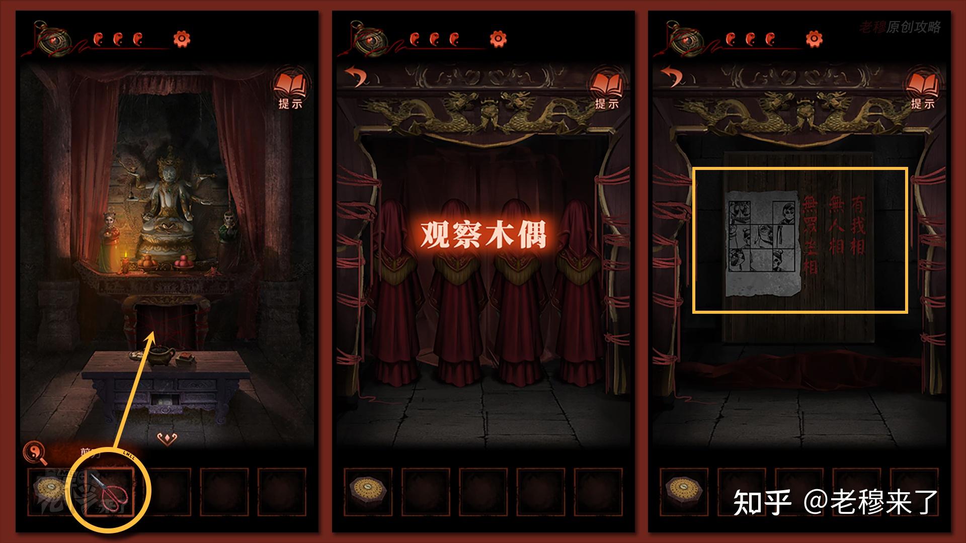 来到六臂佛位置,用【剪刀】剪开下方的红线,完成记忆小游戏,得到新的拼图线索