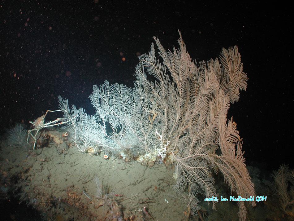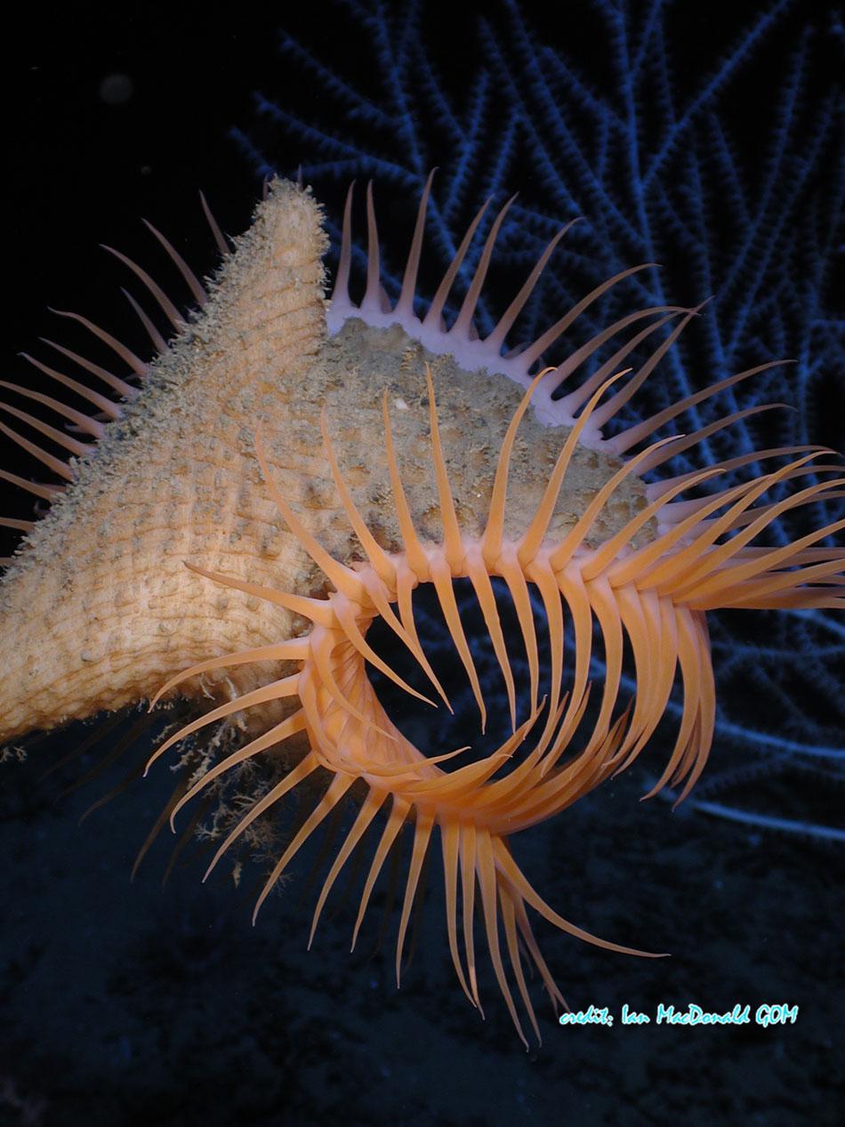 还有形形色色的鱼,虾,海绵,深海珊瑚,水母等等。我晓得你们想看图,放一些墨西哥湾的海底图片吧,也是我的博士项目。墨西哥湾是产油地域,良多能操纵石油成分的生物保存在此。