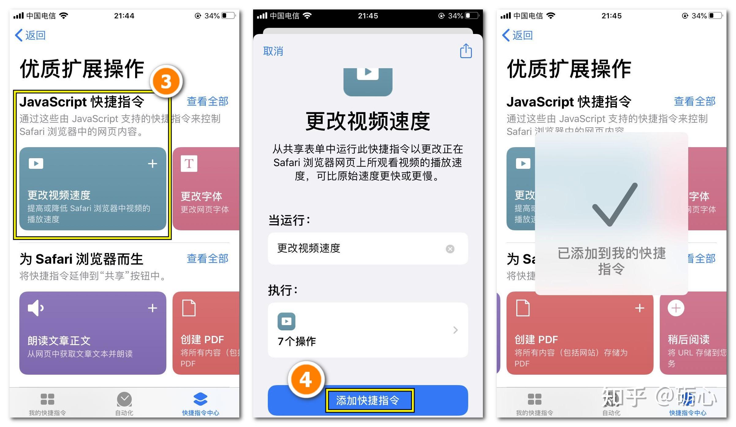 接着找到「JavaScript快速指令」里面的「更改视频速度」,点击并停止添加