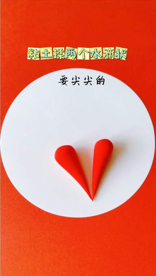 2、用红色的黏土,造做出两个水滴外形,之后用压泥板压扁。