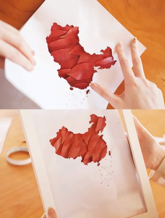 3、最初,为了美妙,可用同样大小的白纸笼盖树叶粘贴的背后,再拆上画框,一幅红色的中国地图就DIY完成咯~
