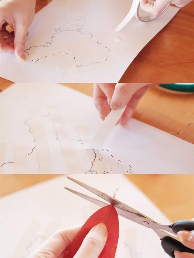 2、接着先将双面胶粘贴在地图上,之后将树叶稍稍裁剪一下,依次有序地粘贴在地图上。