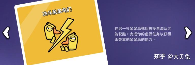 获胜关键:那是呆呆鸟阵营中的另一种变体,需要完成使命获得击杀才能,杀死其他呆呆鸟,最初本身被投票出局,方可获胜!需要第一轮一般玩不要被鸭子刀被其它职业击杀,而且还要苟过第一轮投票。第二轮像鸭子一样玩,但是前提是本身不克不及被其它鸭子刀,在第二轮或者后边一轮被投票出局,还要看鸭子的神色,鸭子杀的多了也没的玩。
