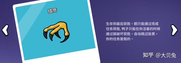 杀人阵营的目的就是杀死所有的鹅,大部门鸭子角色都带有假使命,能够不完成,只要假装成好人就能够了。