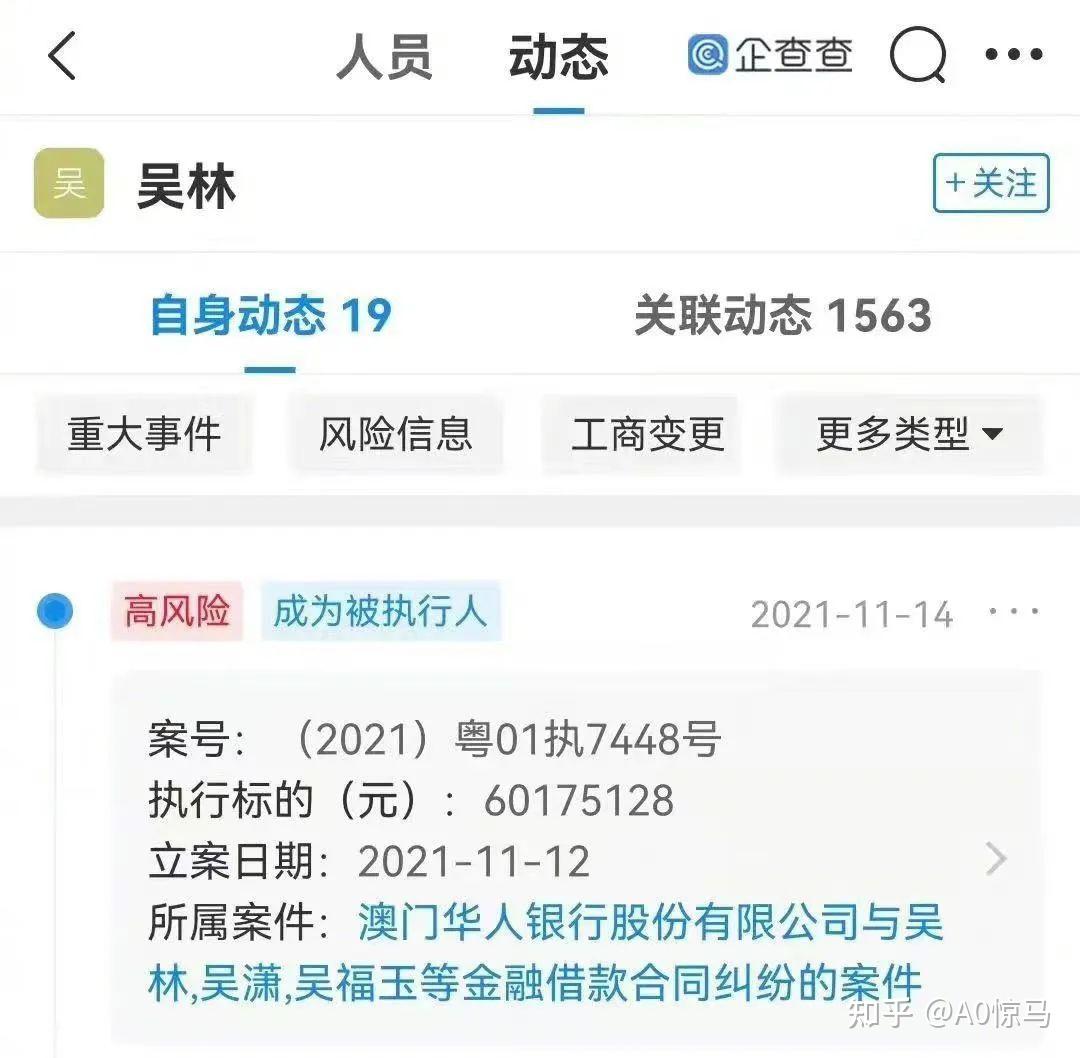 吴林、吴潇、吴福玉等因与澳门华人银行股份有限公司的金融告贷合同**,被施行超6000万元。