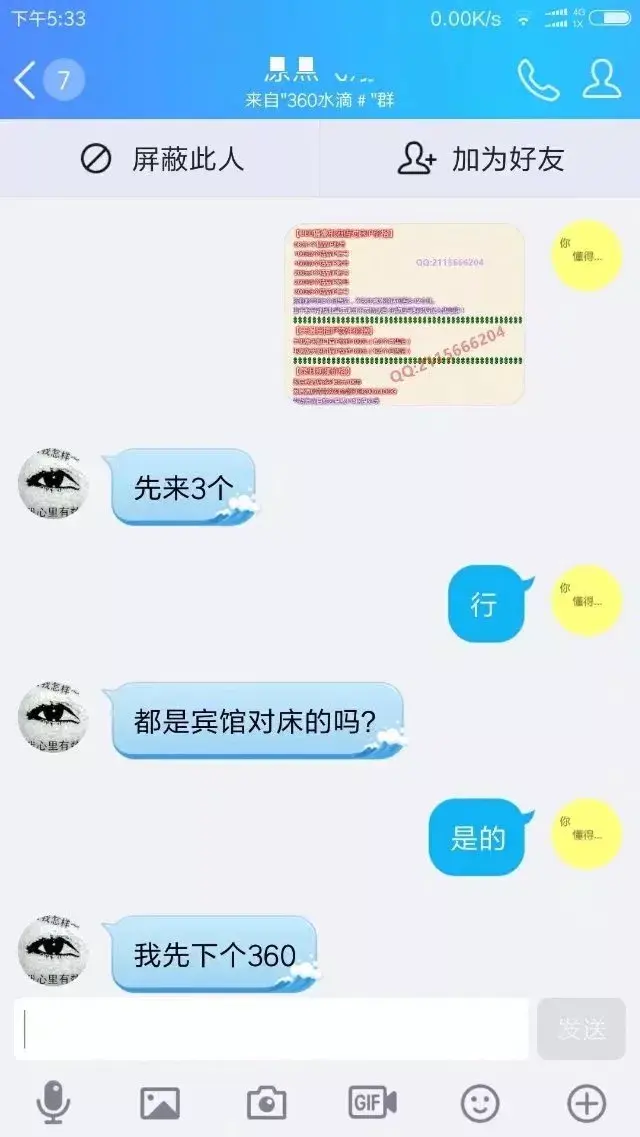 小内觉得好可怕,于是在QQ群里搜了关键词水滴摄像头,公然发现有带着不成描述的介绍的群,料定里面必定有事。加了一下发现满群,但咱不泄气,加了对方提醒的新群。