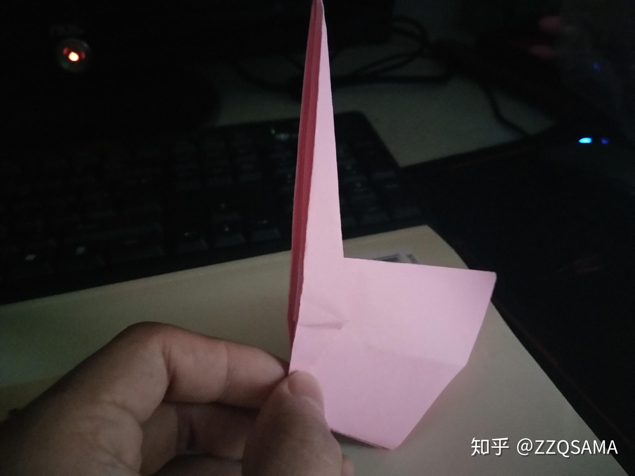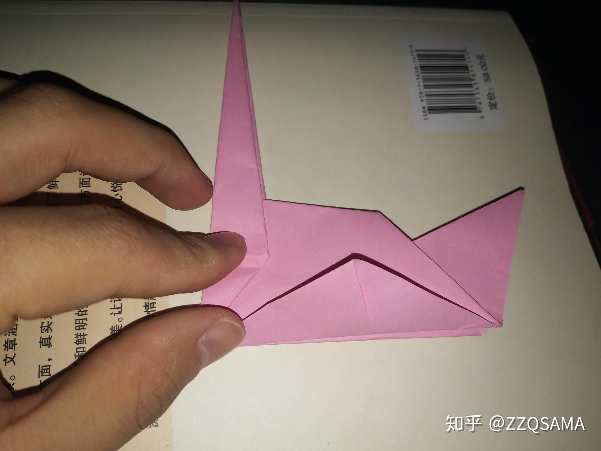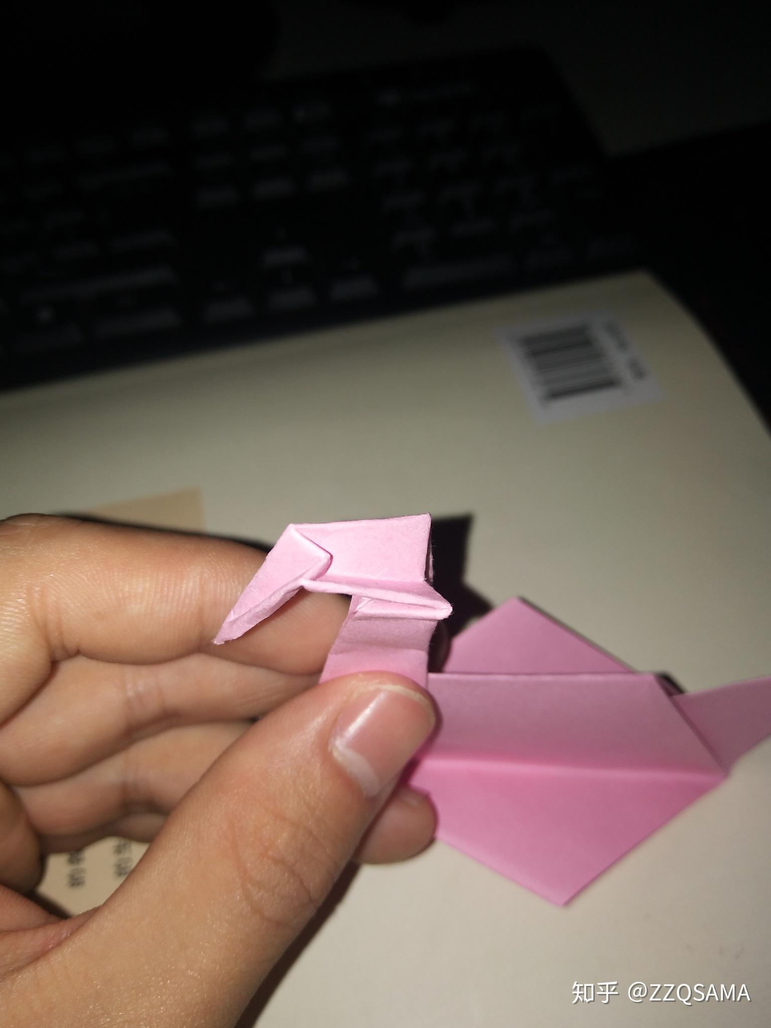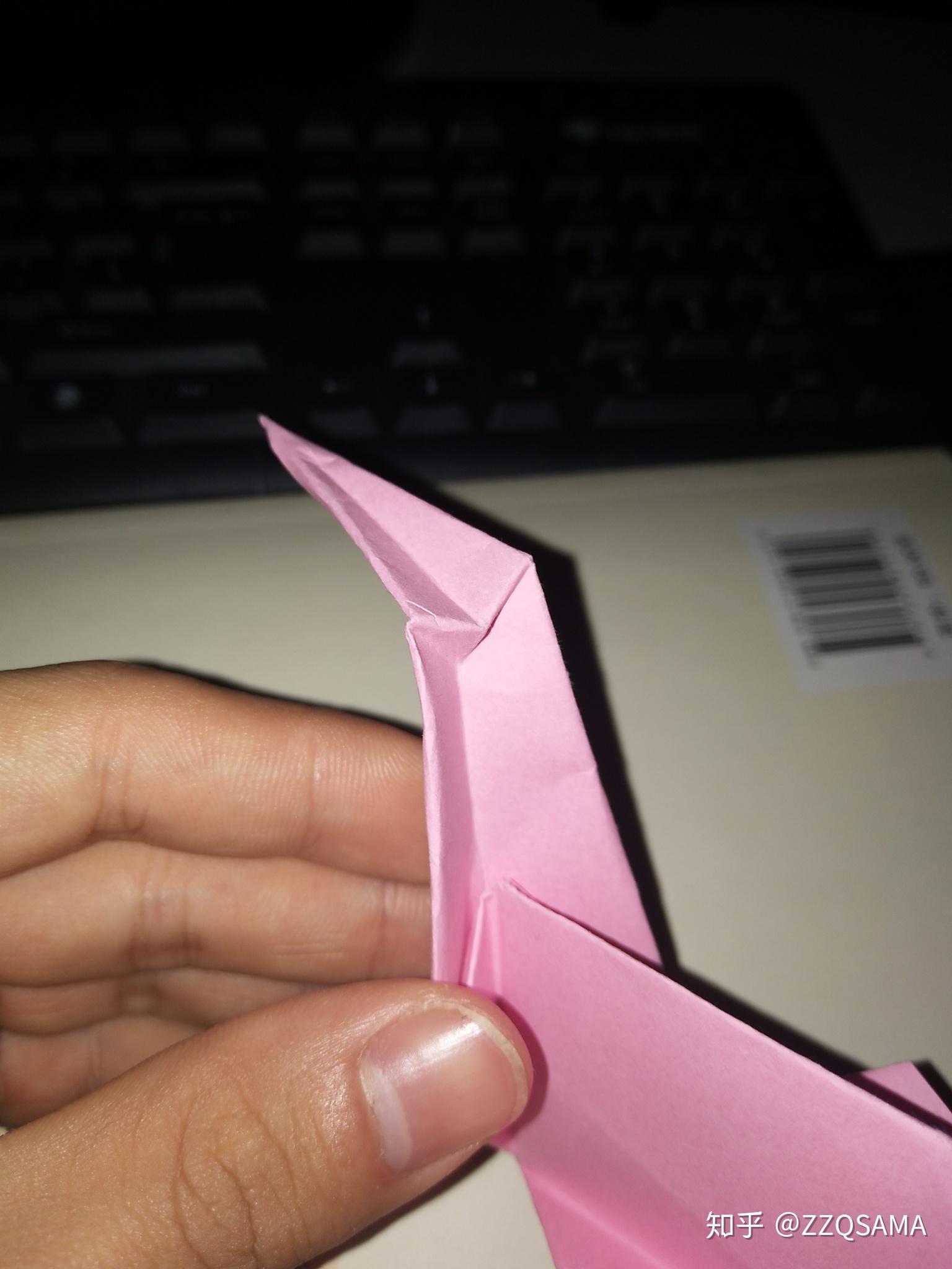 第十一步的最末形态呢,把头部竖起来第十二步,看图,操纵折痕,让颈部天然而然折出来。