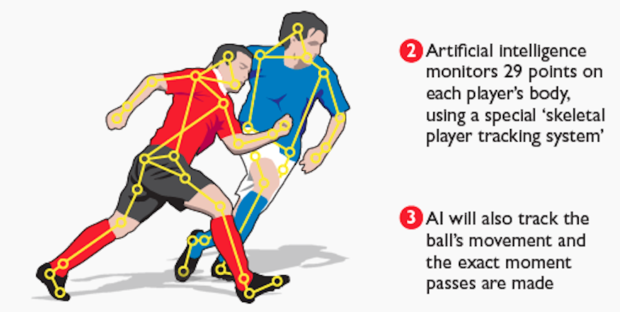 那项新手艺利用安拆在体育场屋顶下方的 12 个公用跟踪摄像头来跟踪球和每个球员的多达 29 个数据点,每秒 50 次,计算他们在球场上确实切位置。搜集到的 29 个数据点包罗与越位判罚相关的所有四肢。
