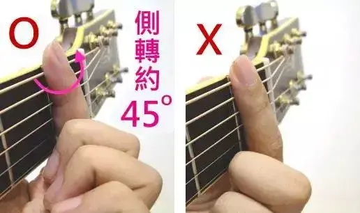 尝尝食指伸曲用食指略微靠近虎口「约呈45度」的那一面来压弦。