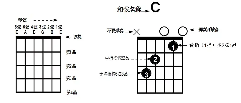 和弦图(上图左)六根纵向曲线代表吉他六根弦面临和弦图时最右边是六弦(最粗),最右边是一弦(最细)。横向的小格子从上往下数是第一品、第二品…,上图左就是常见的C和弦图,你需要用左手按住五弦三品,四弦二品和二弦一品,上图中的数字1、2、3别离代表食指、