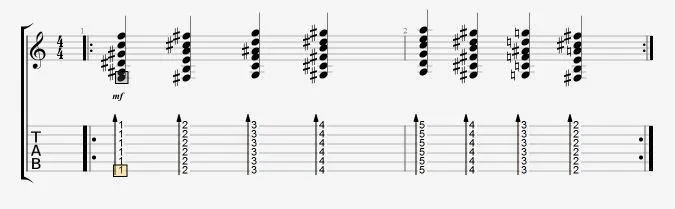 在上图的例子中,0暗示1弦空品(0代表空弦不需要按品),然后是2弦1品,3弦0品,依此类推。