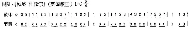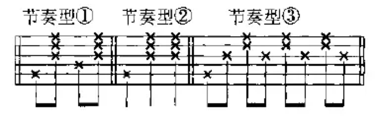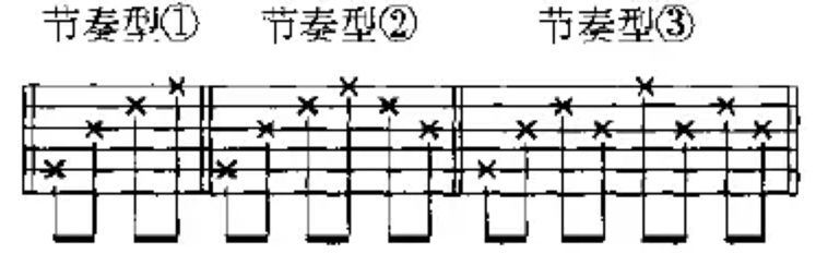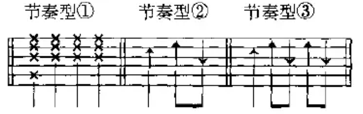 六线谱对吉他常用的吹奏体例(独奏、合成伴奏和漫弹节拍)别离用如下体例记录