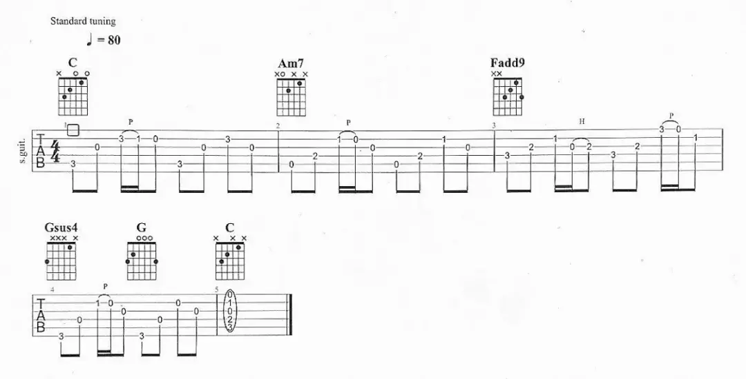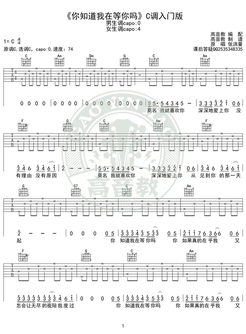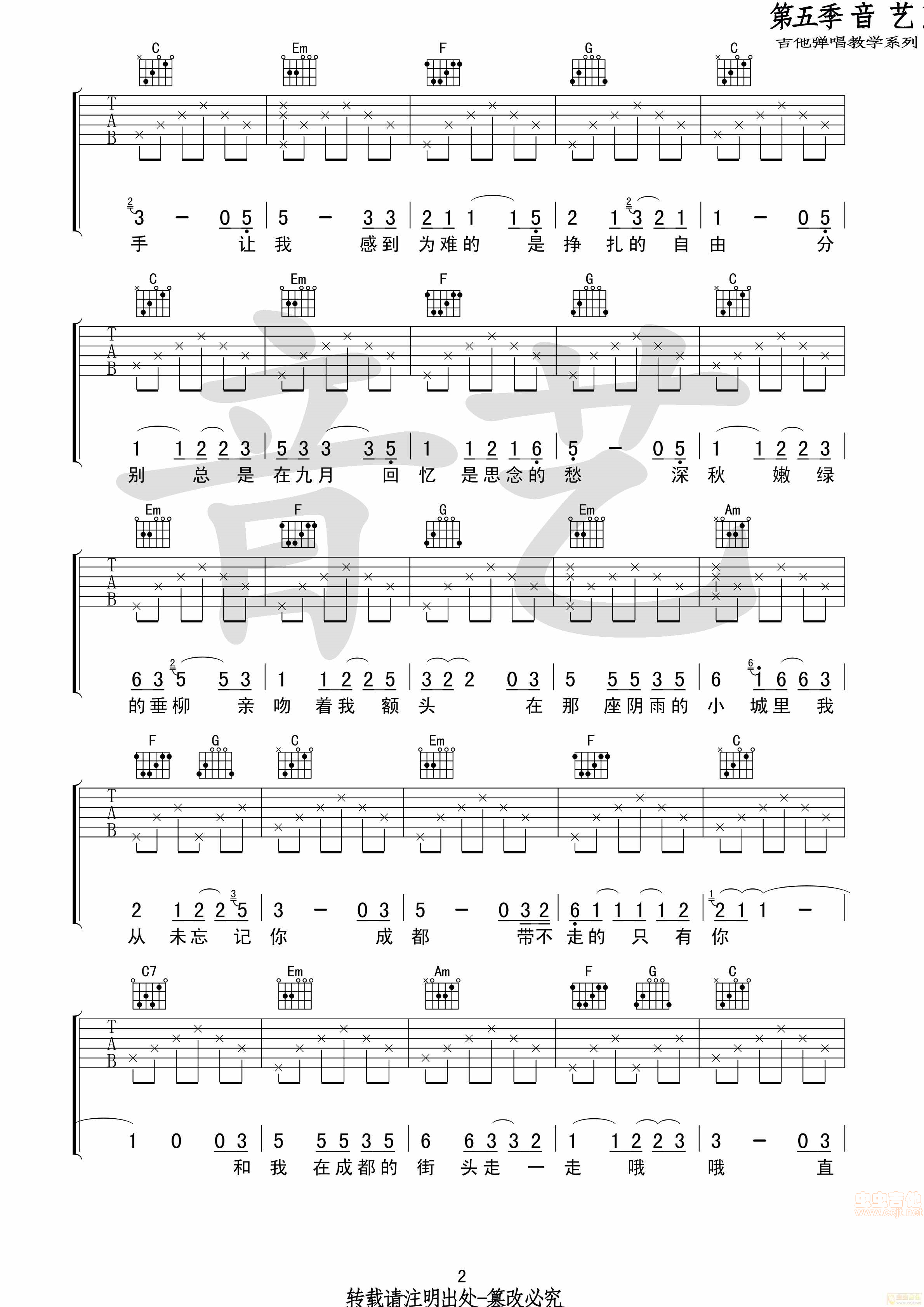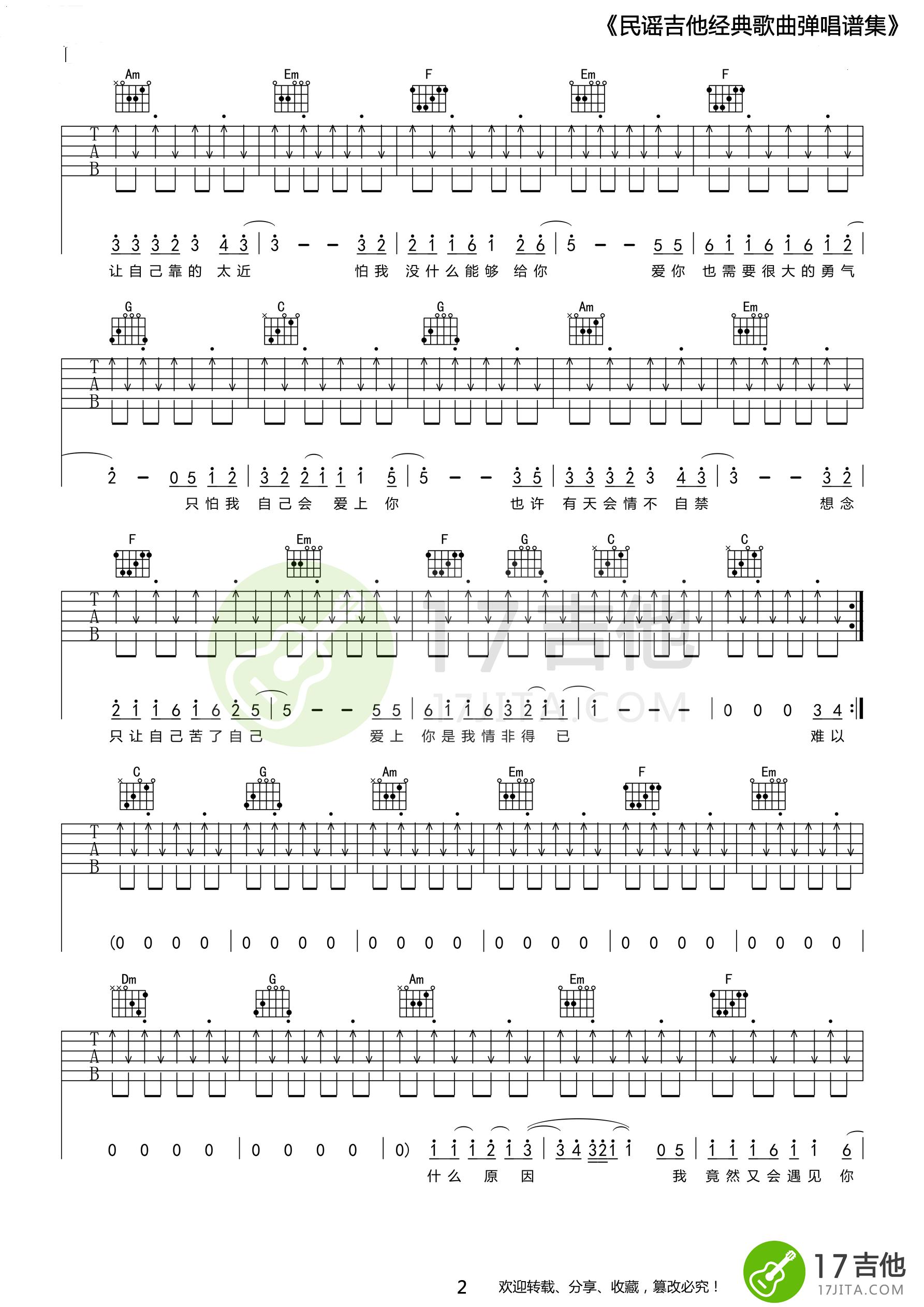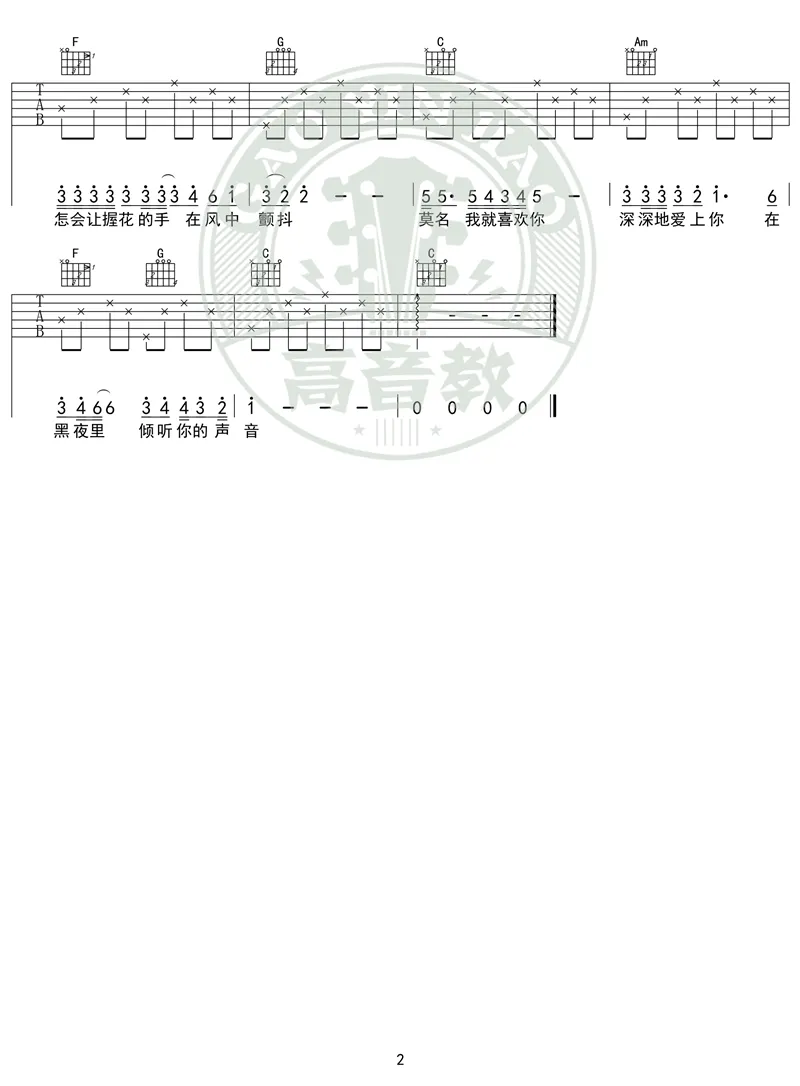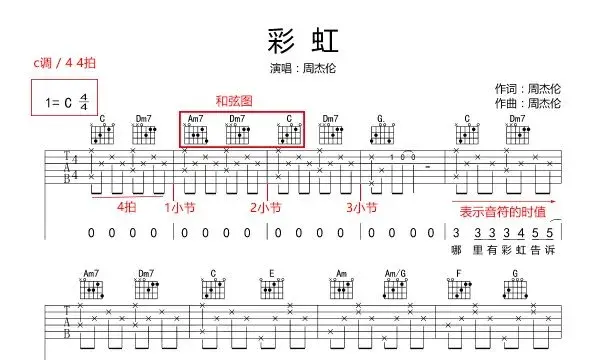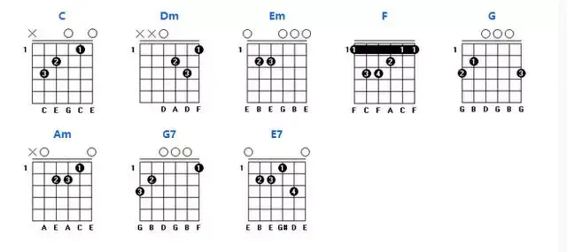 以下吉他谱子中会运用到6个和弦:C、AM、F、G、DM、C7