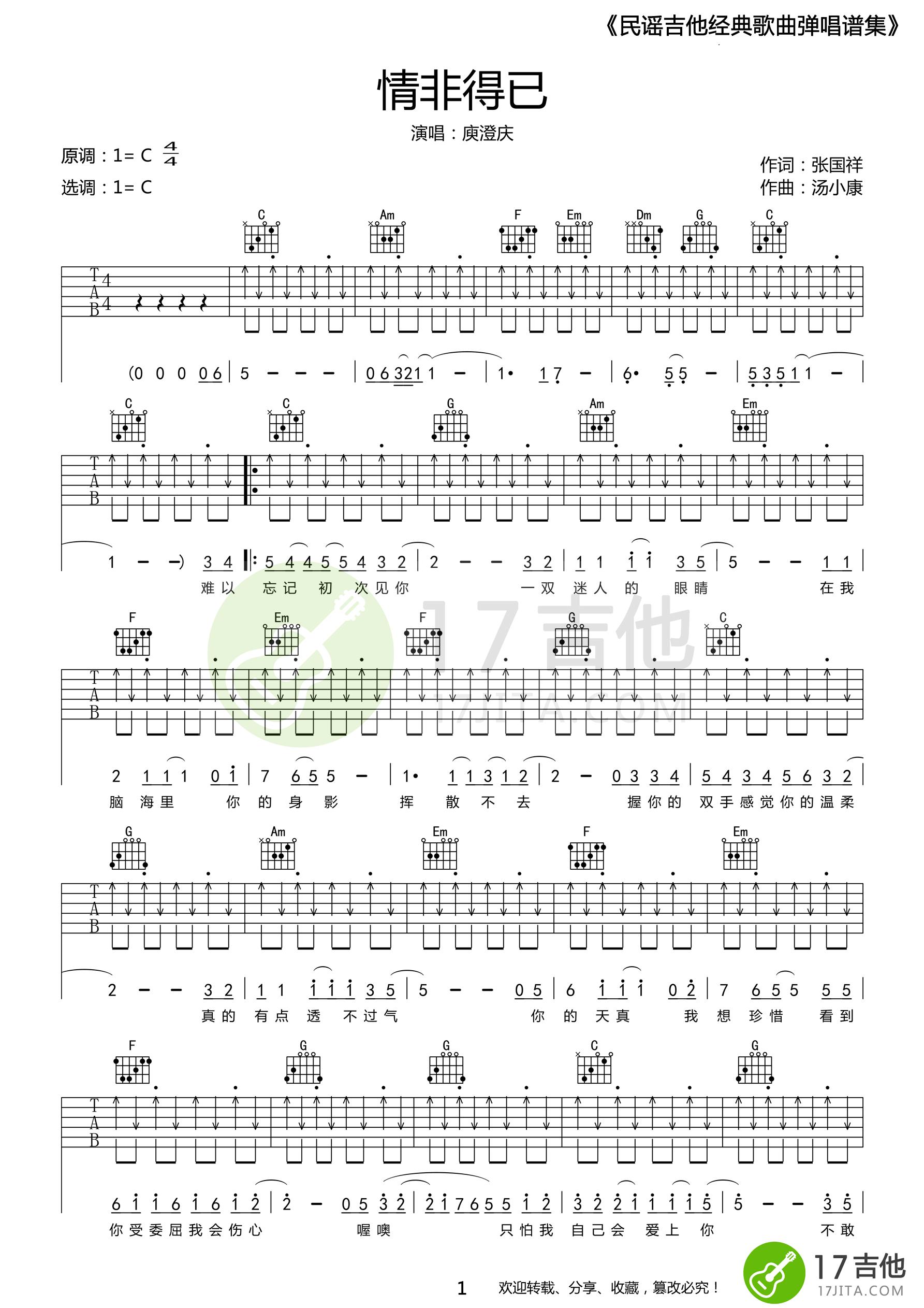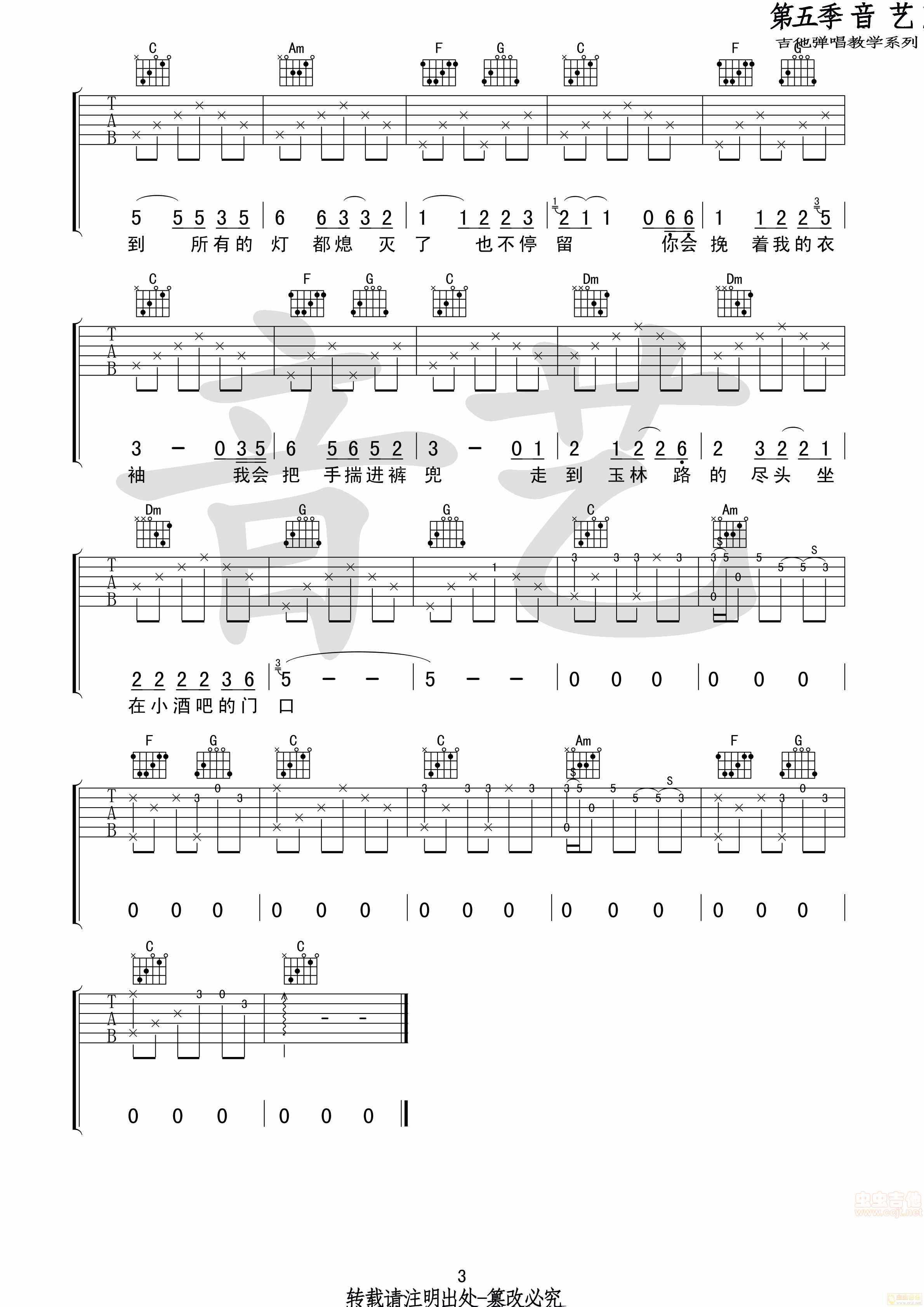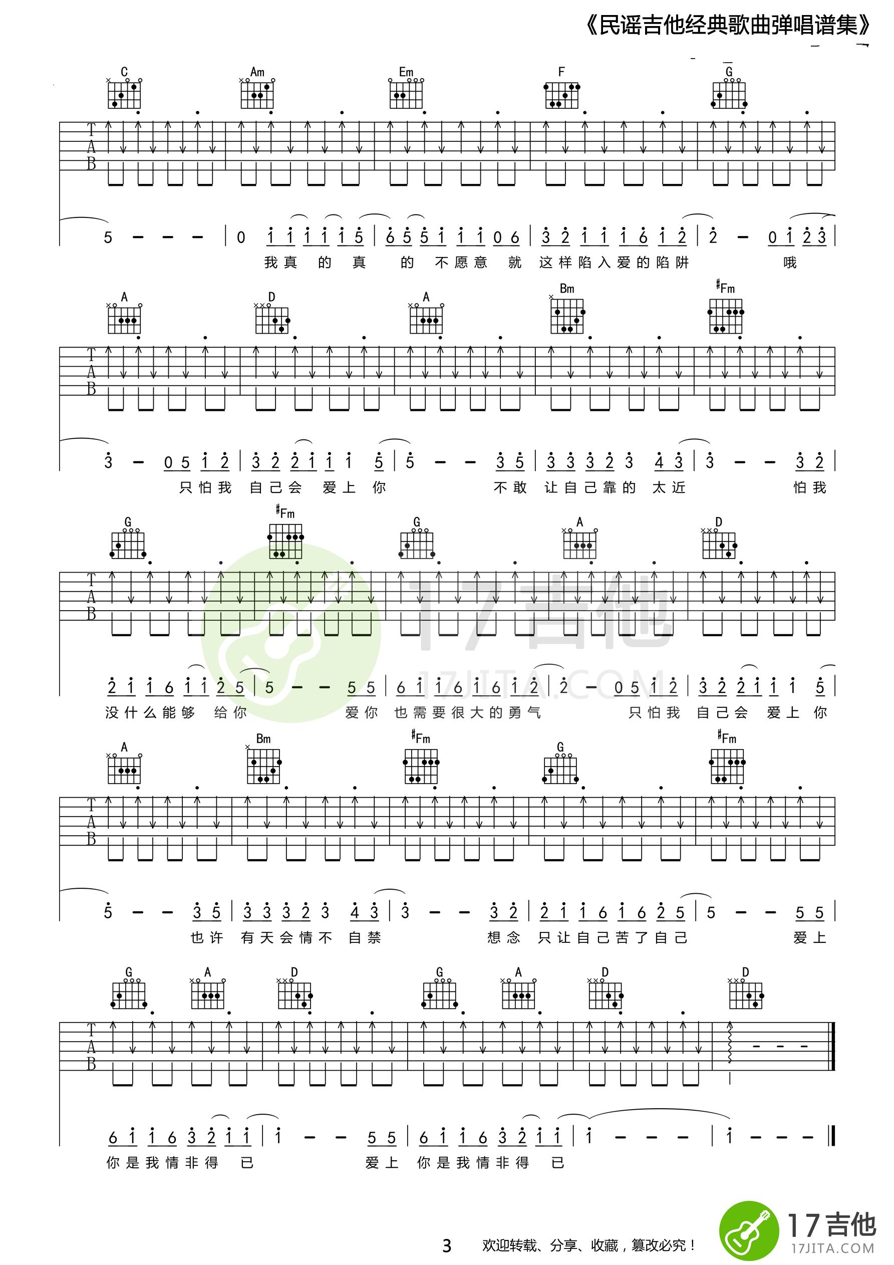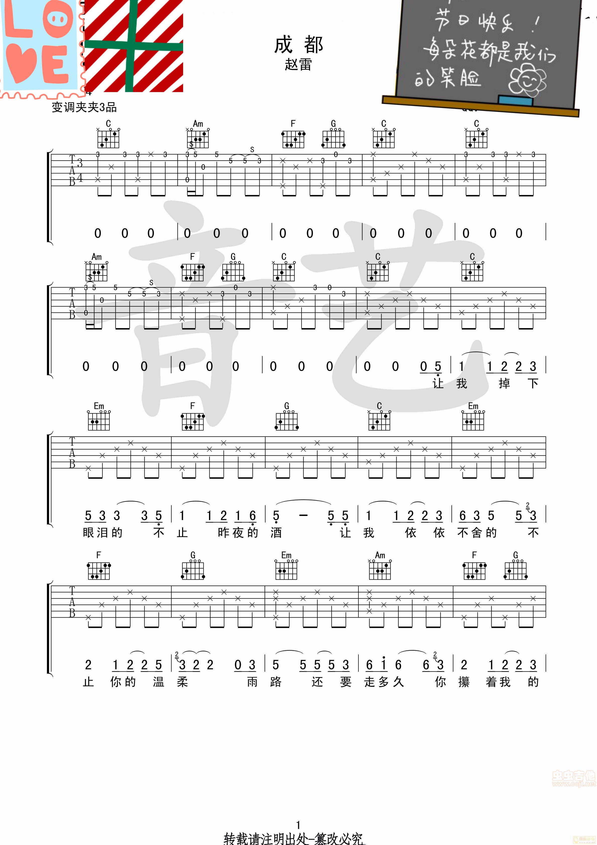 以下吉他谱子中会运用到6个和弦:C、AM、F、G、DM、C7