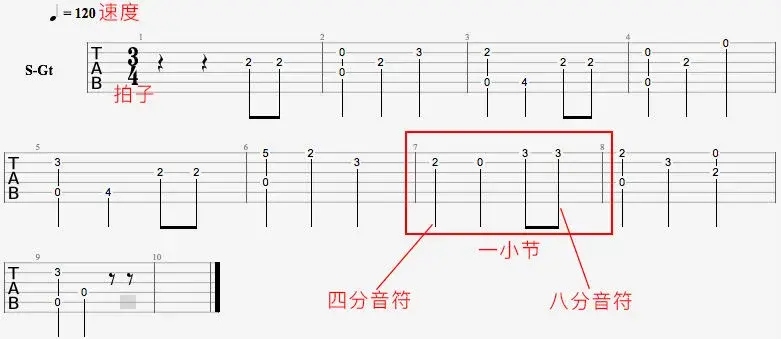 认识了吉他谱上的数字之后,我们还需要从六线谱上获得别的两个重要的信息,那就是速度与节拍,就仿佛是唱歌,哪个字要唱的久,哪两个字要连着唱,整首歌要以如何的速度去唱,那些信息即是谱子中的速度与节拍要表达的,我们以详细的单音他六线谱为例来进修下:(如下图所示)