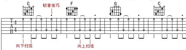 注:上图中的"↑↓"暗示扫弦的标的目的,穿过几条弦就扫几根弦。若是掌握欠好,其实全数扫也无所谓,只要扫的整齐好听就能够了。