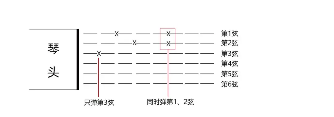 谱顶用一条竖线毗连的两个或两个以上的 “X”暗示用右手指同时拨弦。(如下图所示)