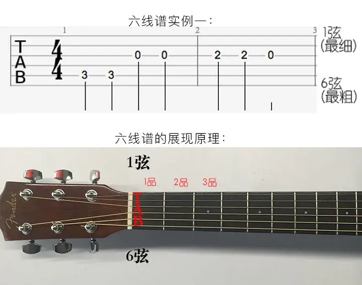 若是上图你看不懂的话,不妨。那时候需要吉他的帮忙,我们拿出本身的吉他来对照着上图就能很曲不雅的看出六线谱上从上到下是在吉他上的哪根琴弦了。(如下图所示)