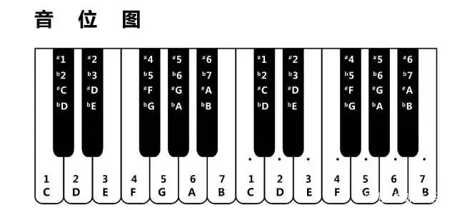 搞大白了12均匀律的划分特点(3、4,还有7、1之间是相邻的,没有任何琴键相隔,其他个键都有一个黑键相隔。),那么我们来进一步领会一下。