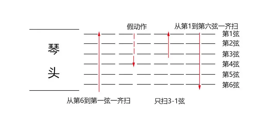在六条线上画“↑”、“↓”等符号,此时六线谱上方也往往有关于左手指法的提醒。图中的箭头暗示我们要按箭头所指的标的目的快速扫弹箭头所盖住的琴弦,没有盖住的弦不消扫弹,图中的虚线箭头是我们调理动做的假动做,需要动做,但不要扫弹发音!(如下图所示)