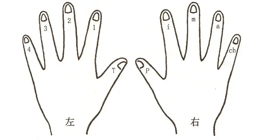 p(pulgar的简写)——拇指,负责拨4、5、6弦i(indice的简写)——食指,负责拨3弦m(medio的简写)——中指,负责拨2弦a(anular的简写)——无名指,负责拨1弦ch(chico的简写)——小指,不常用