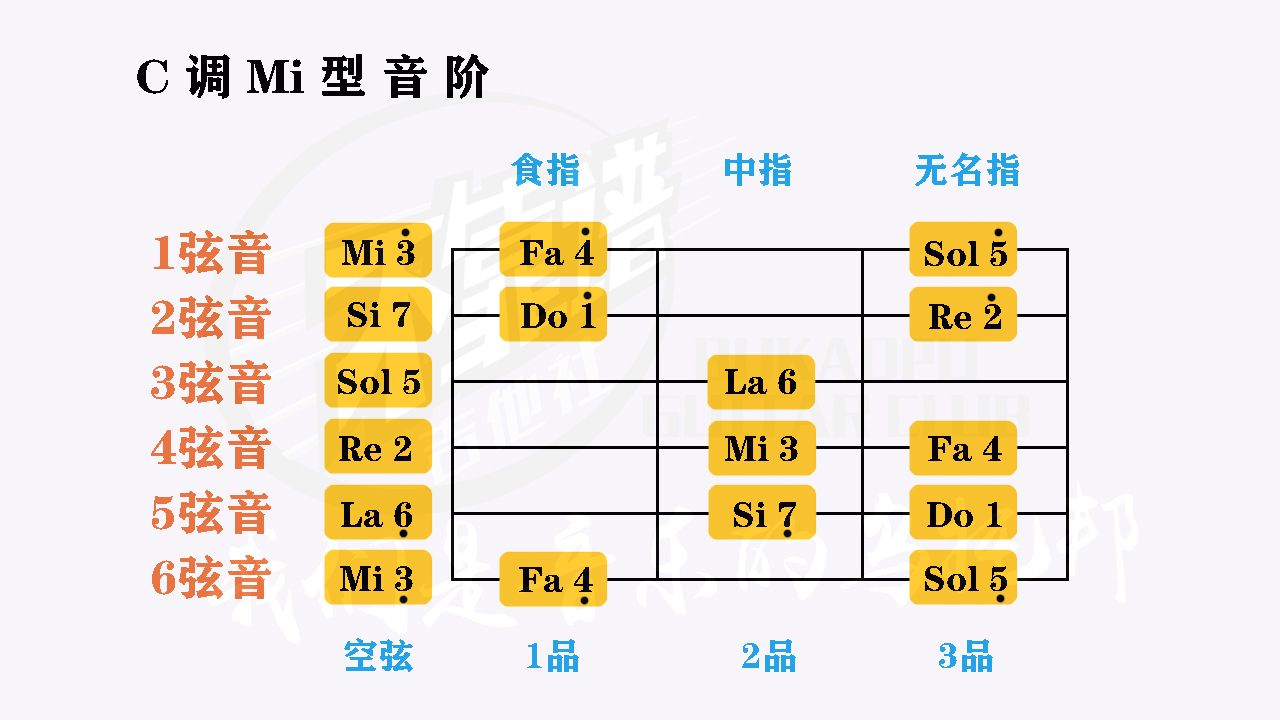 1——食指2——中指3——无名指4——小指左手各指分工:空弦(0)不消按,第1品用1(食指)按,第2品用2(中指)按,第3品用3(无名指)按,第4品用4(小指)按。本节课程只操练C大调的根底音阶,所以4(小指)不消按弦。