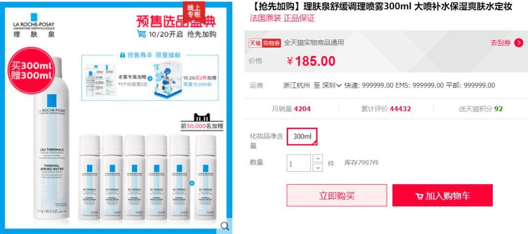 相当于165元买300ml,并且喷雾那种,我实的比力喜好小包拆,送的6瓶50ml size就刚刚好,便利照顾也便利随手喷,前50000名的话,只要你准点去应该是没问题的。