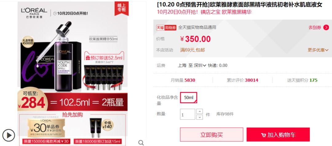 欧莱雅那个优惠写的比力诚笃,只标出了但凡拍定金都能获得的7收7.5ml的赠送。