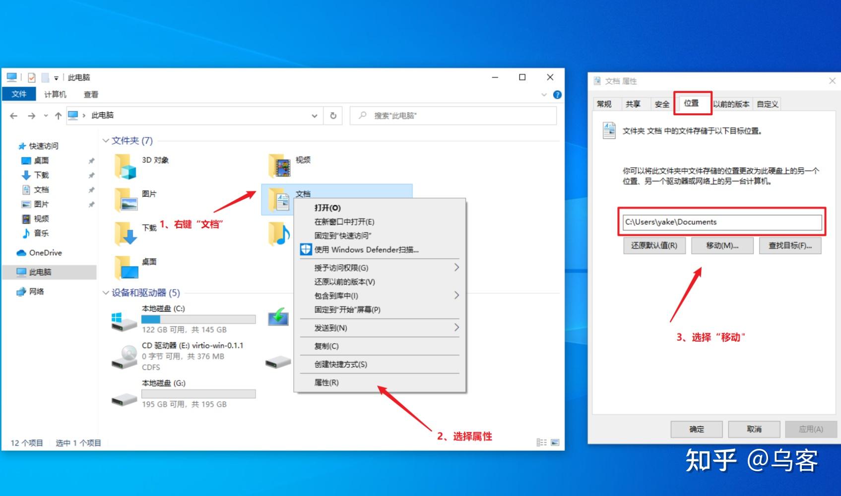 在“文档”上点开右键>选择“属性”>在菜单中选择“位置”>再选择“挪动”