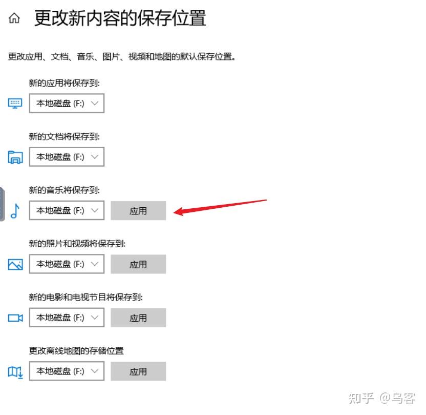 同样是在存储选项中,在“更多存储设置”中选择“更改新内容保留位置”——选择此外盘符(好比F盘)点击应用。如许就能够把新内容保留到此外盘上,从而进一步的腾出C盘空间来。