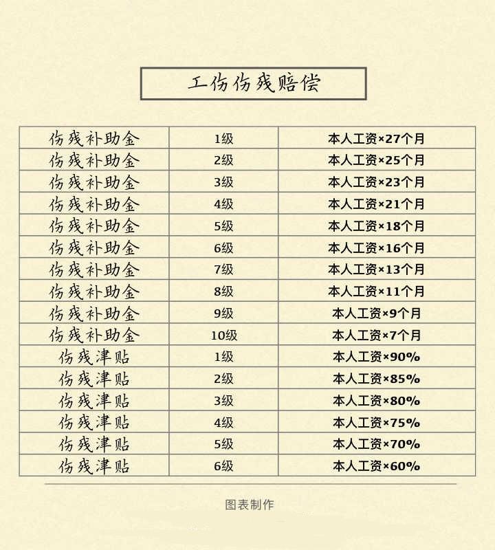 伤残补贴金+伤残津贴。补偿尺度见下图: