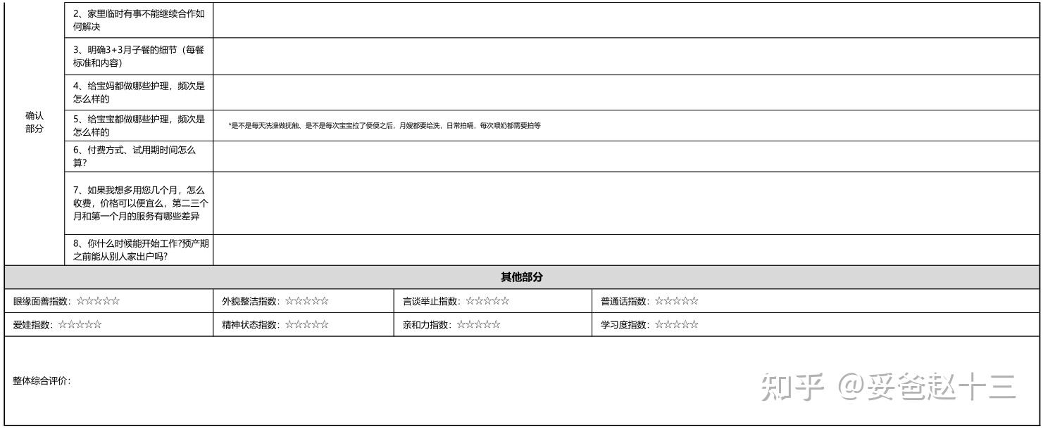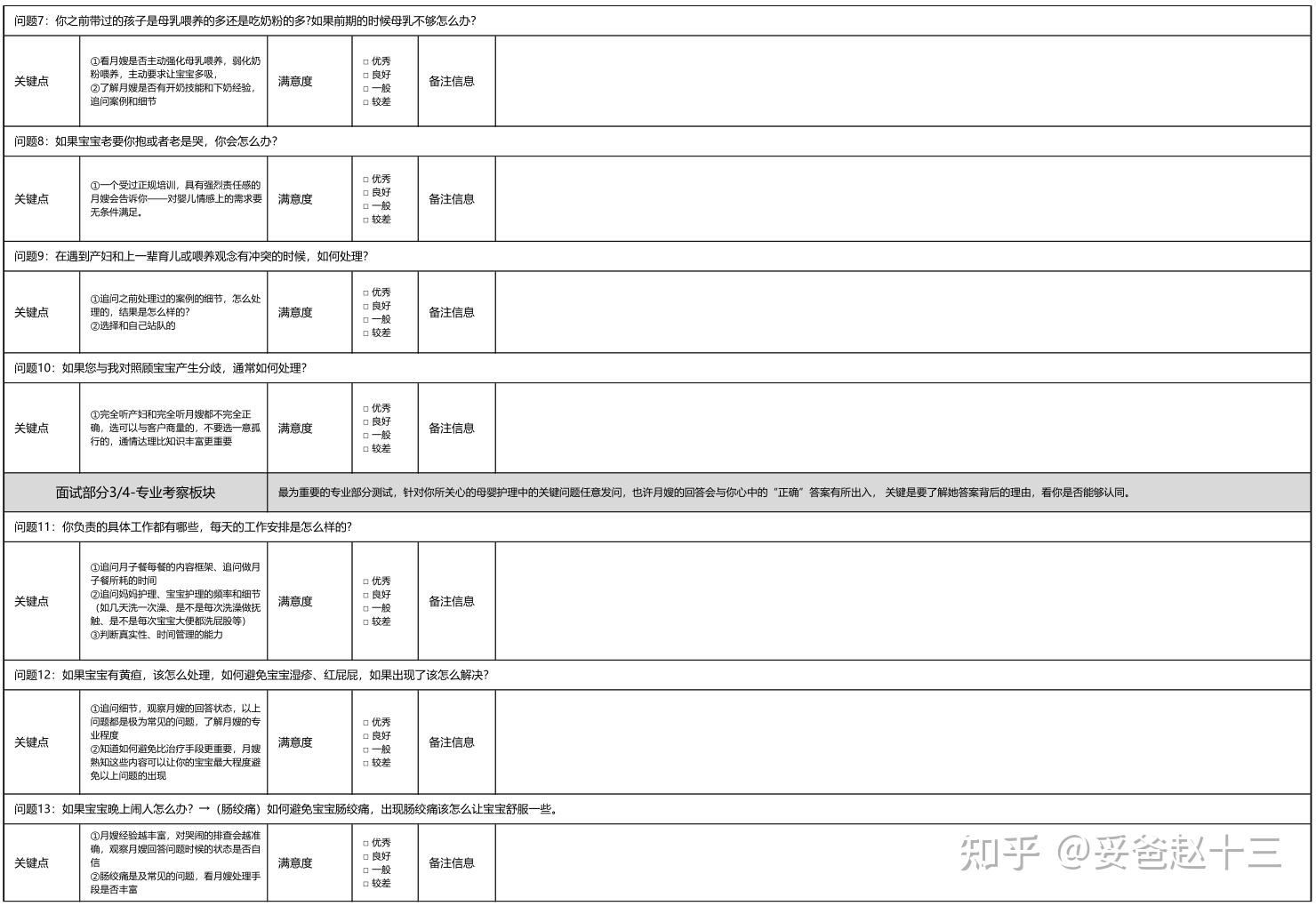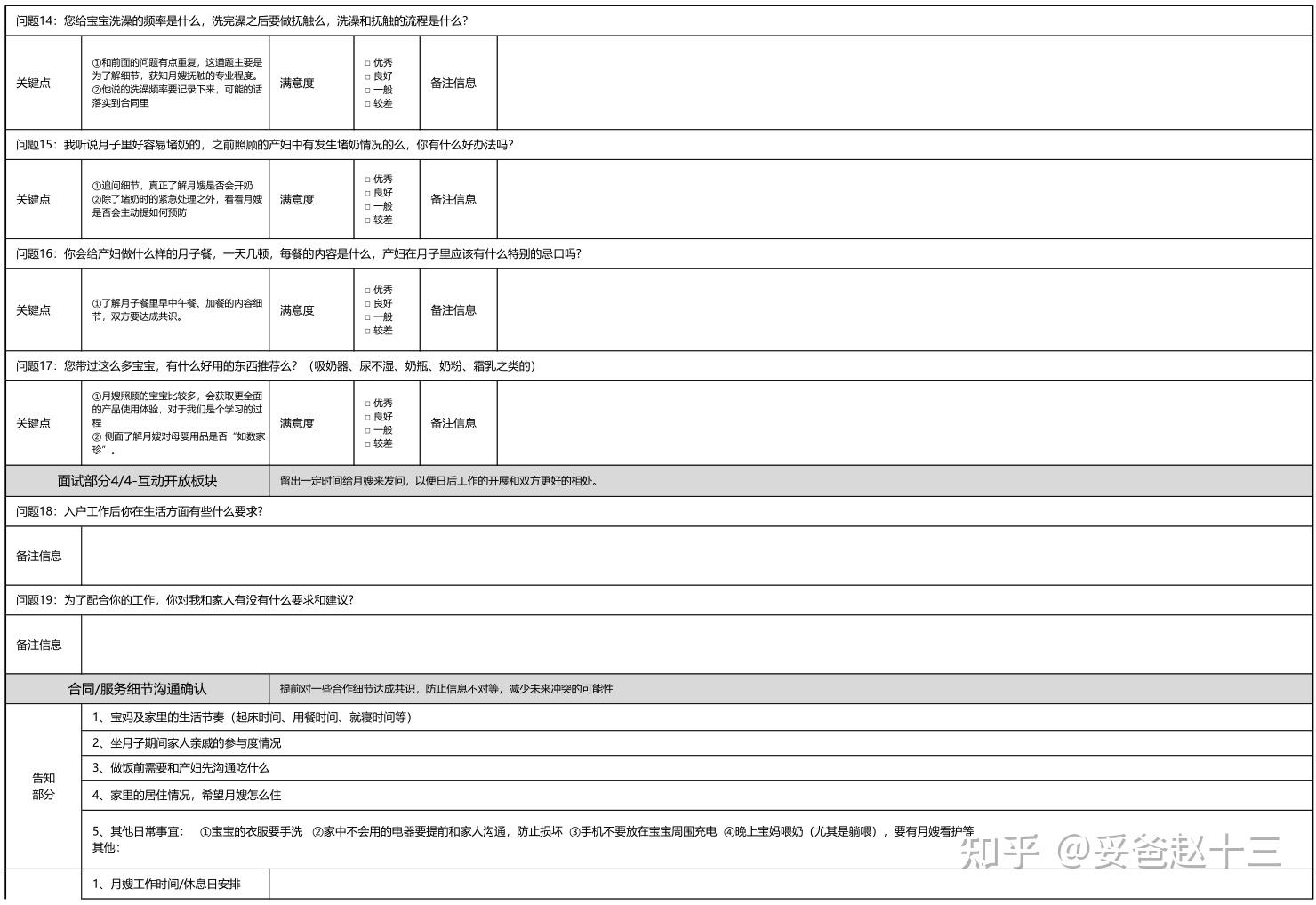 (以问题2为例)面试表中标识出了要本题领会的“关键点”,同时可对月嫂答复的能否满意停止评判打分,并留出了空白,能够记录关键信息