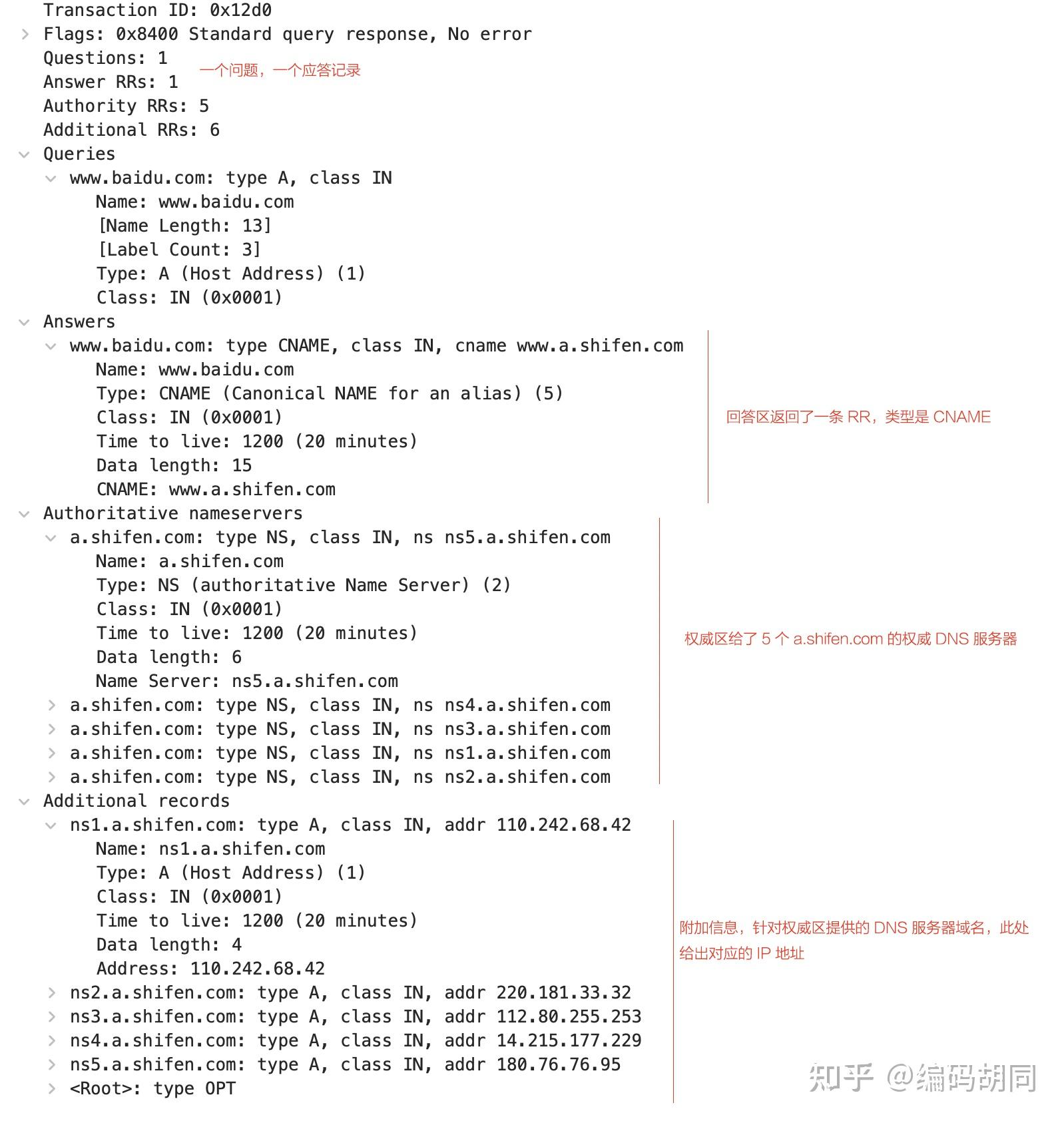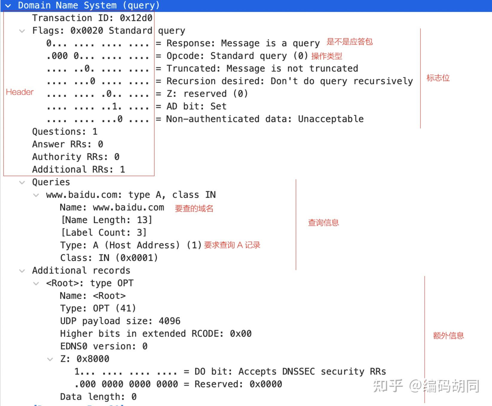 Queries 之前的都是头部(一共 12 字节。别的因为那是个查询恳求,body 部门没有”答复“和”权势巨子“信息)。