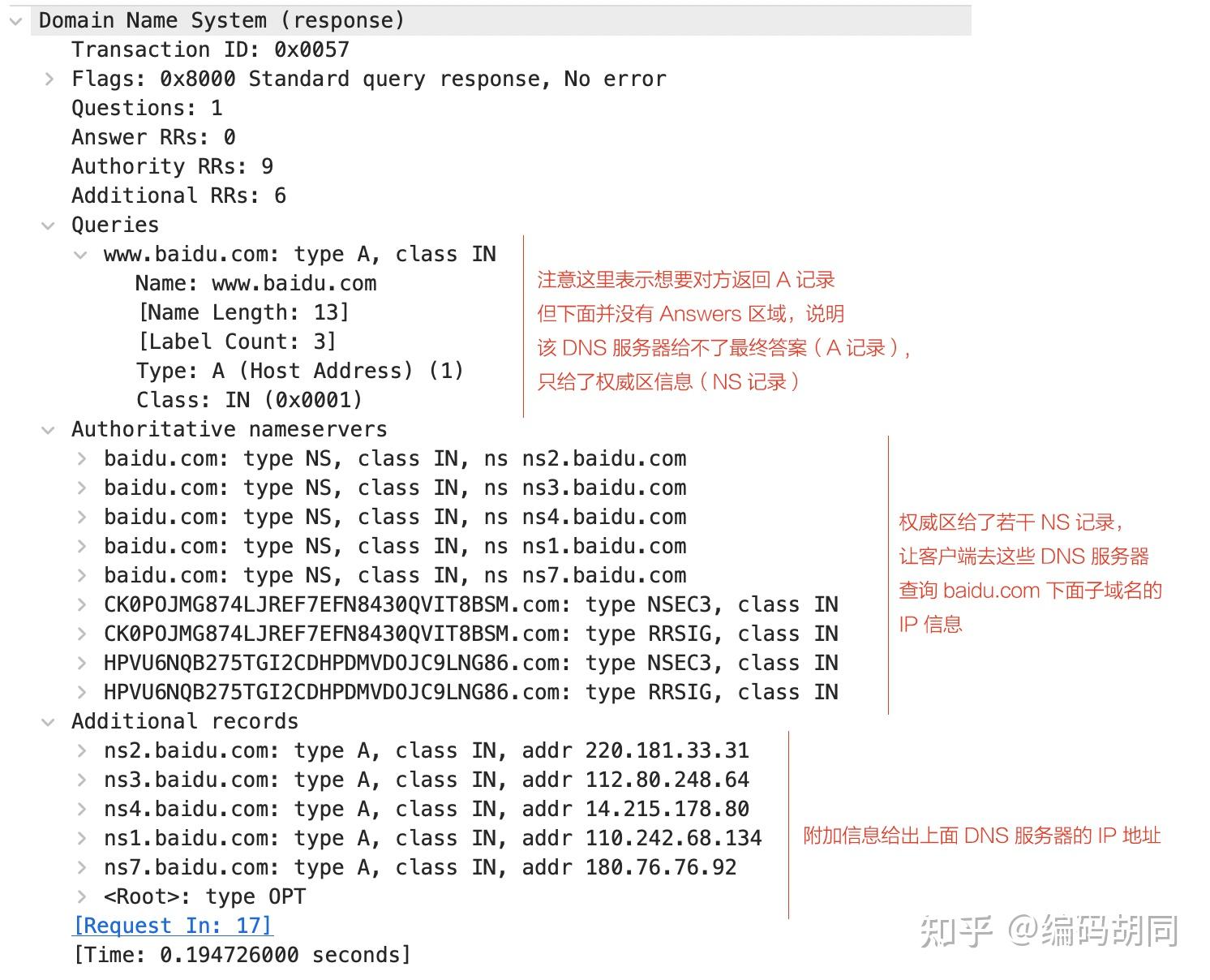 上面是百度的权势巨子 DNS 办事器给出了 CNAME 应答,而关于 TLD 办事器,它不会给出 CNAME 或 A 应答,只会给出 NS 应答,指示客户端去以下 DNS 继续解析。我们看看 No.18 的应答信息: