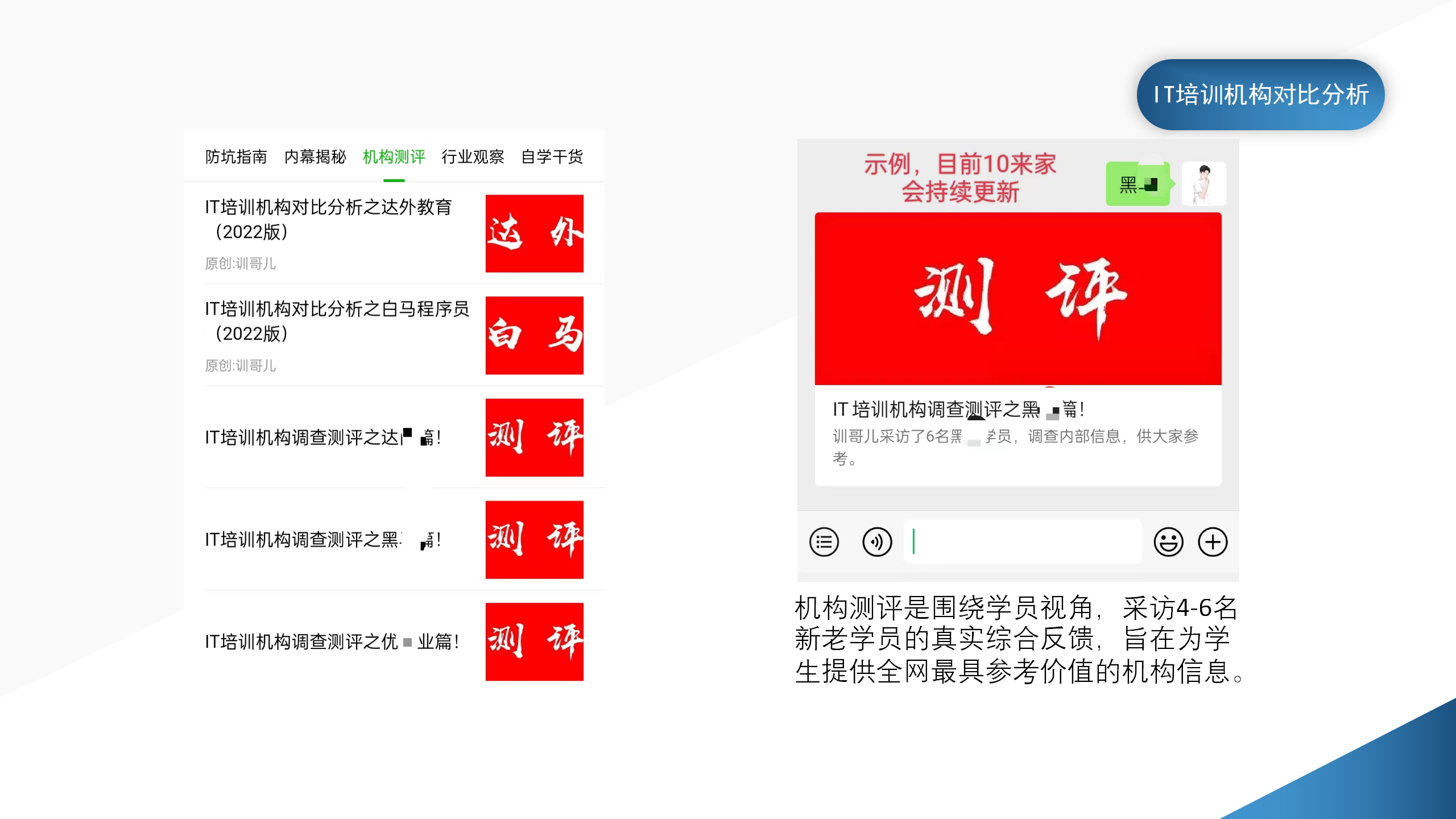 2.矮子里面拔高个儿。当你实正领会了IT培训,你就会发现他所列举的机构大多是告白打得响的,几乎都算不上“靠谱”,找几家差的来陪衬相对不那么差的,煞有介事的打上1234星,其素质是在一群矮子里面拔高个儿,那“高个儿”能高到哪里去呢?不外,后来训哥儿仍是根本确定了,就在我说他信息过时之后(他17年写的,我19年说的)。他一个两年多没动静的号竟然更新了,整了个2020版。。。如今又过了两年多,不晓得他会不会再次更新。