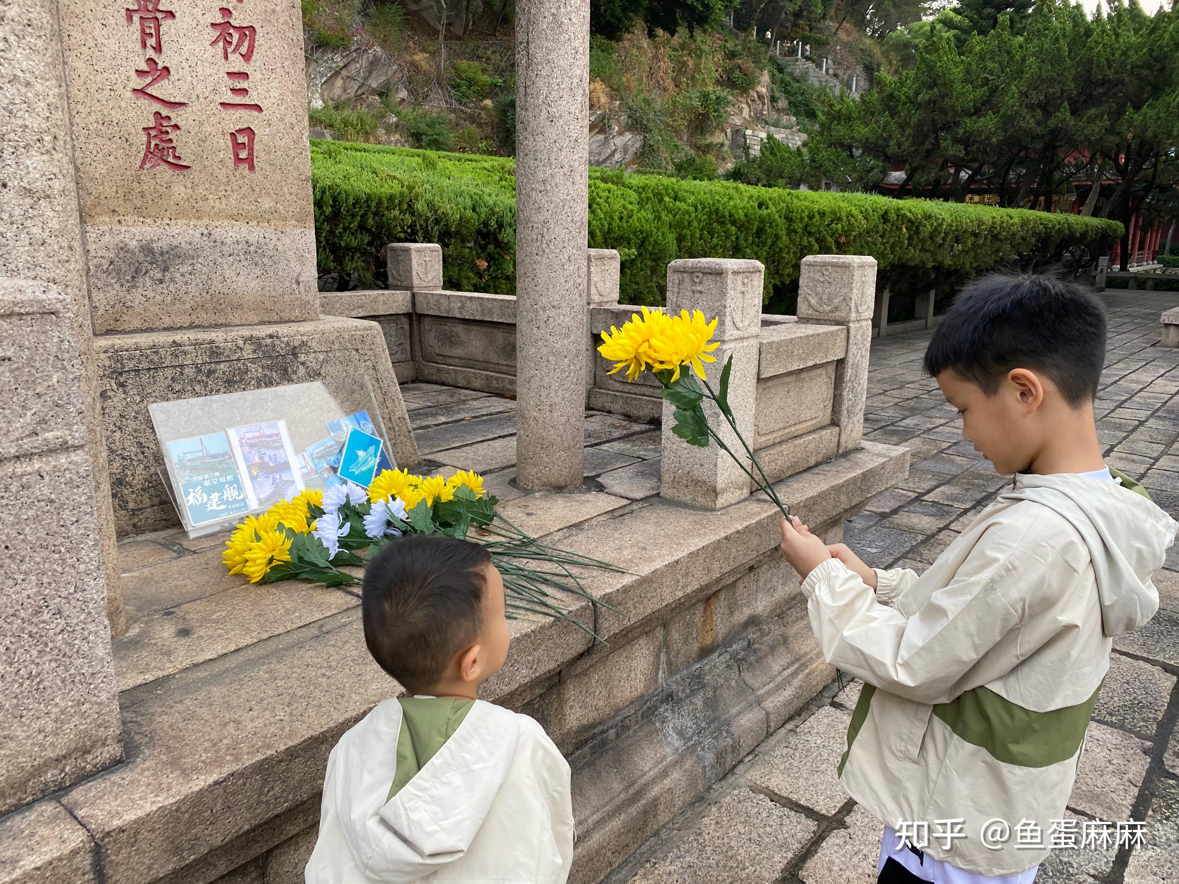 研学材料会发放菊花,最初在英雄纪念碑献花。如今的孩子生活在城市,少了许多祭拜的时机,孩子上小学也没有实正的学过祭拜礼,此次借那个时机教一下。