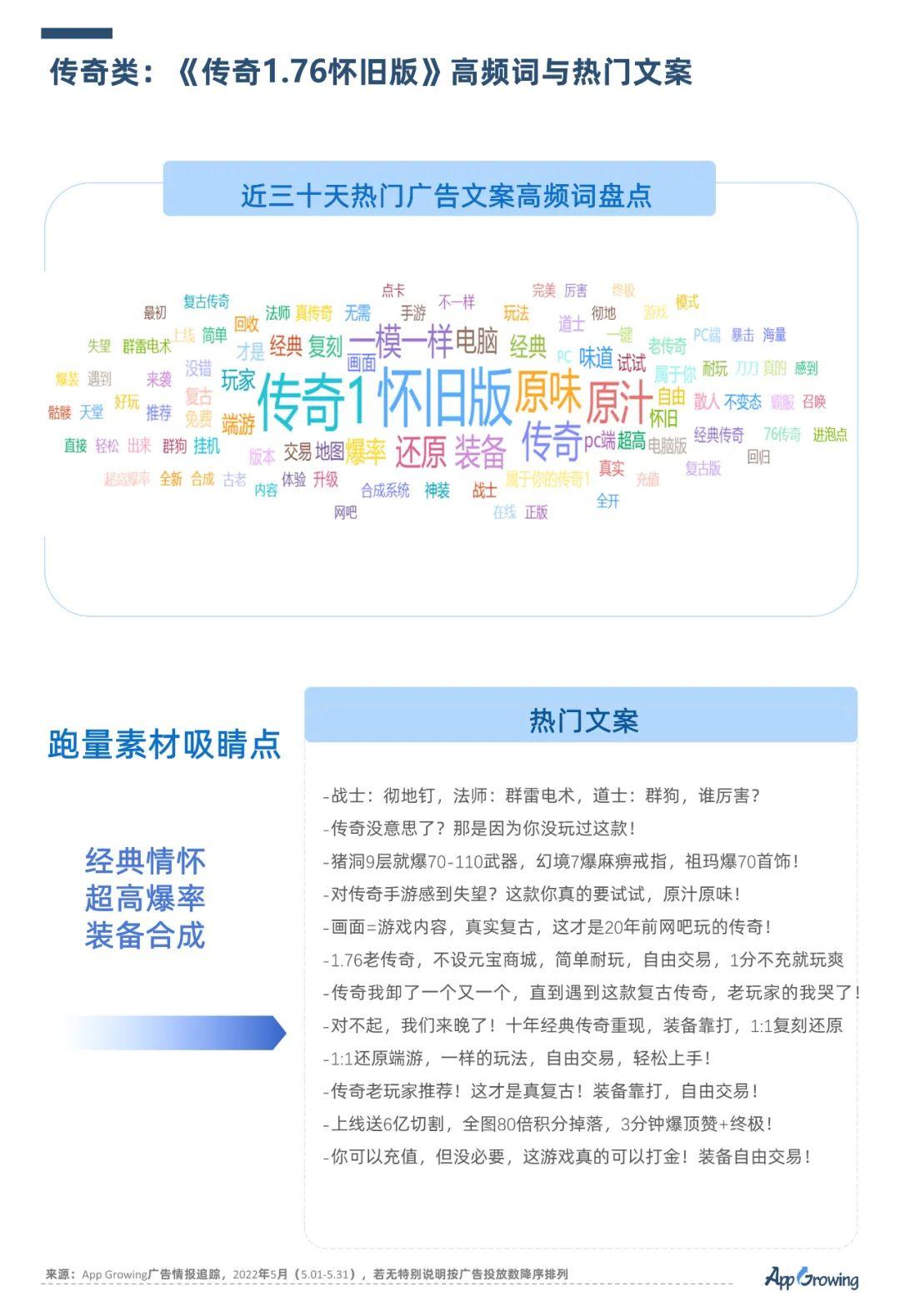 3-4 传奇类手游素材阐发传奇类手游的营销卖点不断都离不开炫酷配备、情怀召回、高爆等核心要素。以传奇1.76怀旧版为例,告白高频词贴合传奇类手游的核心要素展开,配备”“典范”“超高爆率”“原汁原味”等频繁呈现。