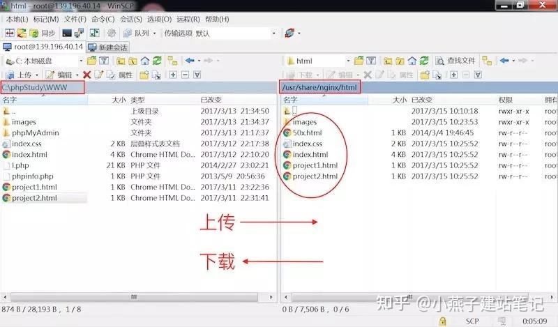 第40步,左侧目次切换到存放网站法式的目次,右侧切换目次到/usr/share/nginx/html下面,然后从左向右拖动文件,就能够上传文件了。若是要从云办事器下载一个文件或者目次到当地计算机,则从右向左拖动文件或者目次。