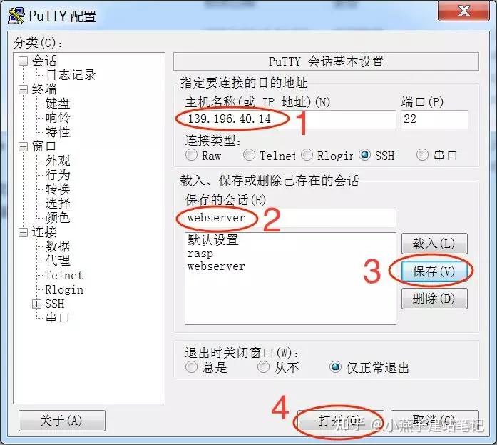 第30步,主机名称输入云办事器的公网IP地址,保留的会话输入“webserver”,点击保留按钮,点击翻开按钮: