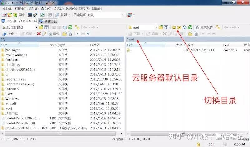 第39步,在弹出的警告窗口点击按钮是,看到右侧云办事器默认进入了/root目次,左侧是当前条记本电脑的目次和文件。