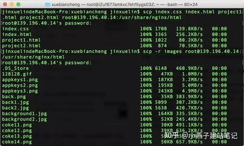能够利用号令如下:scp index.html index.css project1.html project2.html root@139.196.40.14:/usr/share/nginx/html多个文件名之间用空格分隔。