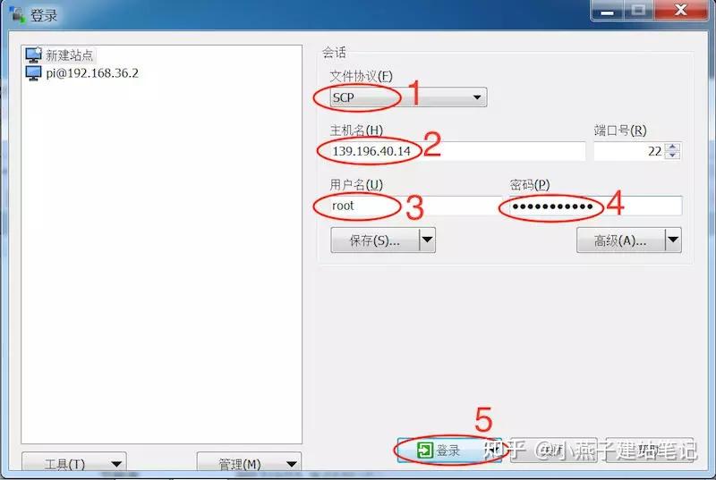 然后安拆过程一路都是“下一步”,完成之后,启动WinSCP法式,进入新建站点页面,输入登录信息:
