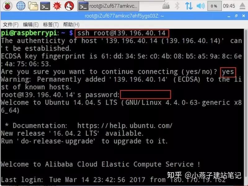 第28步,若是在树莓派电脑里面,在“LX末端”法式间接运行号令 ssh root@云办事器IP地址,输入yes回车,然后输入密码回车,就能够登录到云办事器了。