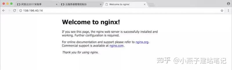 第35步,在当地计算机上面翻开一个阅读器,输入网址http://云办事器公网IP地址并回车,应该看到如下网页显示,申明nginx安拆胜利。