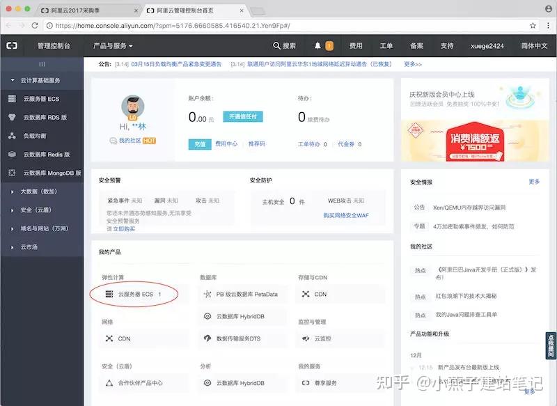 第24步,看到“我的产物”下面的“弹性计算”里面的“云办事器 ECS”右边呈现了一个“1”,暗示云办事器创建好了。