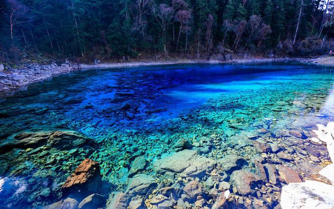 五彩池是九寨沟里最小的湖泊,但又是颜色最丰硕的一个。湖水如梦如幻,从天蓝,碧蓝,到榄绿。气候好时,能看到蓝天白云的映在水面上。冬季来访也没关系,当四周蒙上白雪时,五彩池也不会结冰,别有一番风味