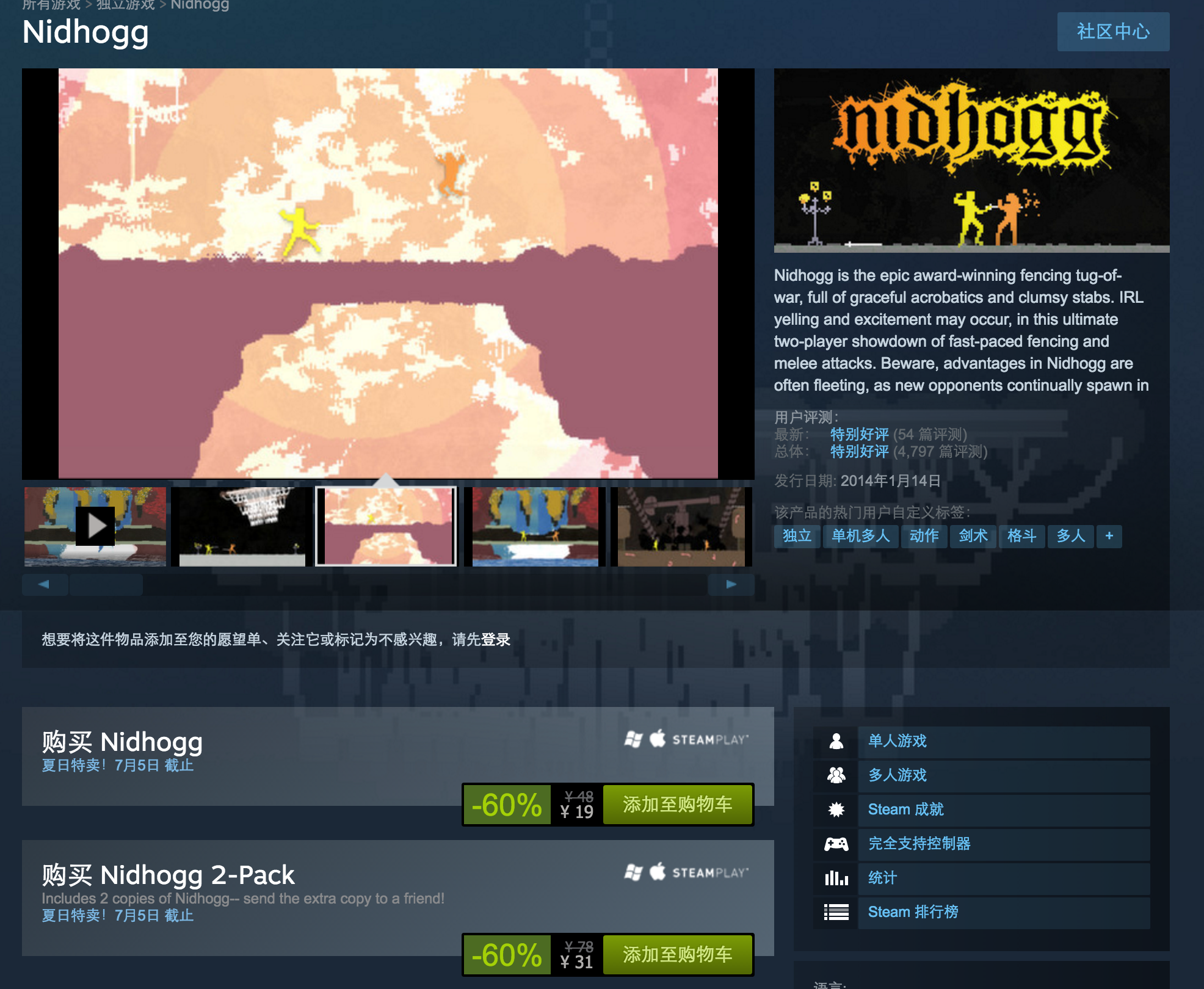 一款很合适双人对战的游戏,两小我要勤奋击杀对方,会有良多意想不到的喜感排场。游戏内容不算多,原价49小贵,但如今动手就很适宜了。