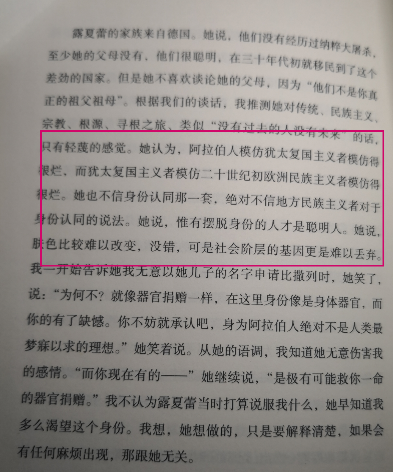 关于身份认同,小说傍边的露夏蕾(尤纳坦的母亲)则有着非一般的观点。