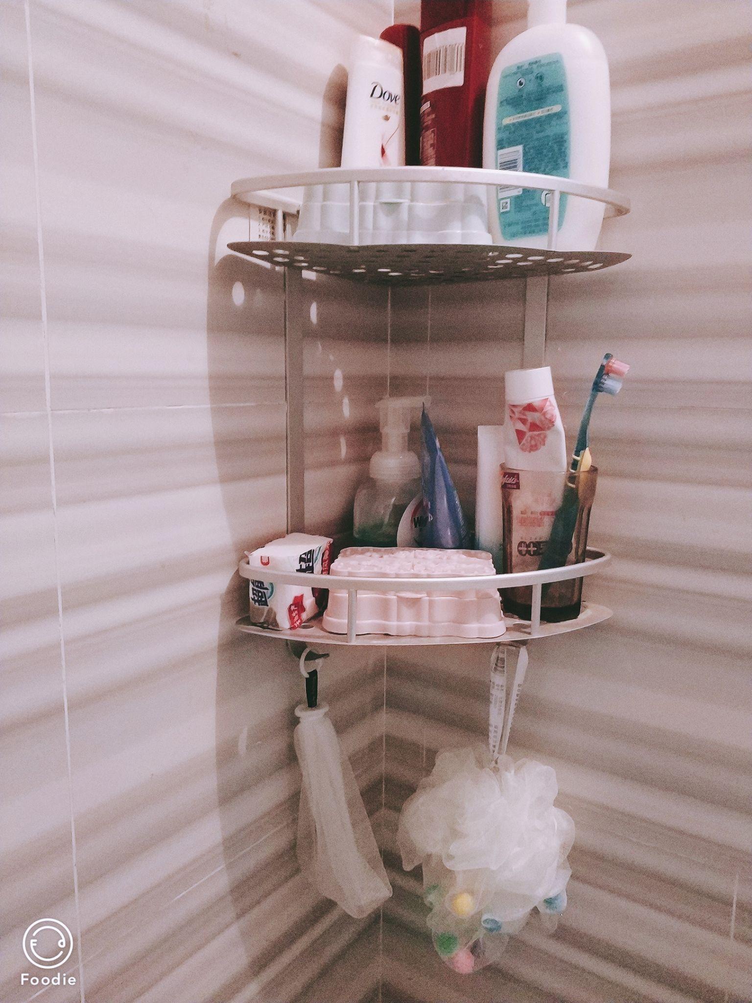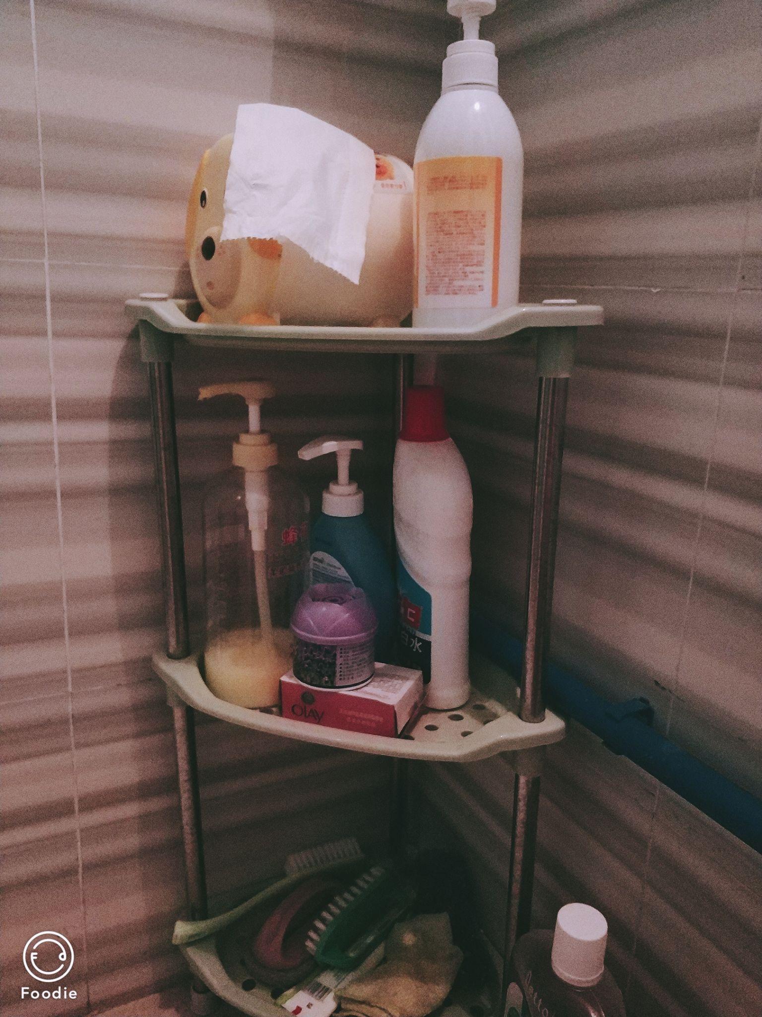 那个最上面放的是洗发露,洗澡露以及内衣专洗皂,下面一层放的是洗手液,洗面奶,牙刷杯自以及用来洗袜子的肥皂。