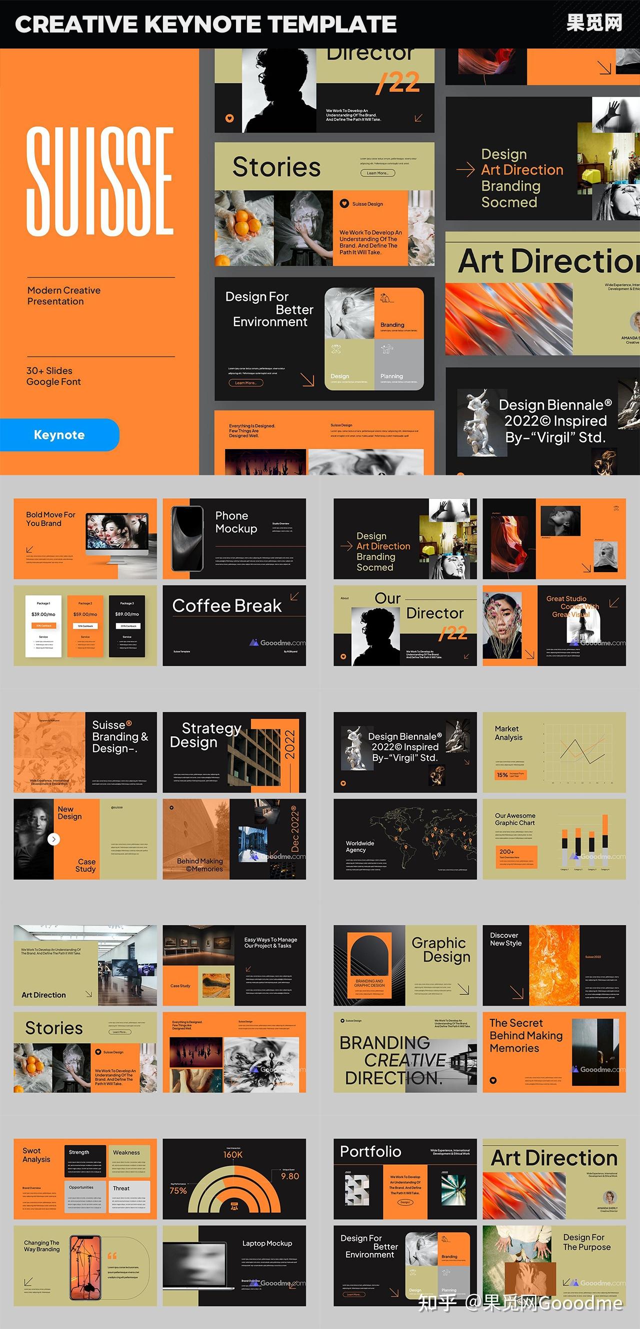 20页黑色极简时髦品牌VI手册标准指点手册排版设想PPT-keynote模板▶ 艺术宣传推广主题的展览讲座keynote橙色模板-SUISSE SUISSE – Creative keynote Template